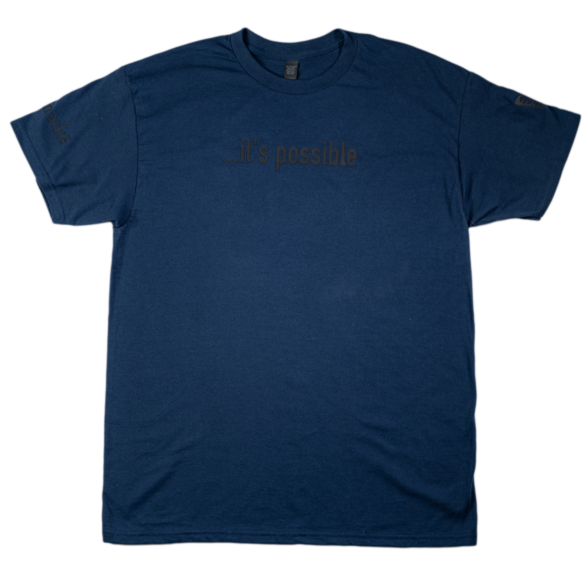 We've decided to keep the dark on dark trend going with the much requested black on navy "its possible" t-shirt from the motivated summer collection.